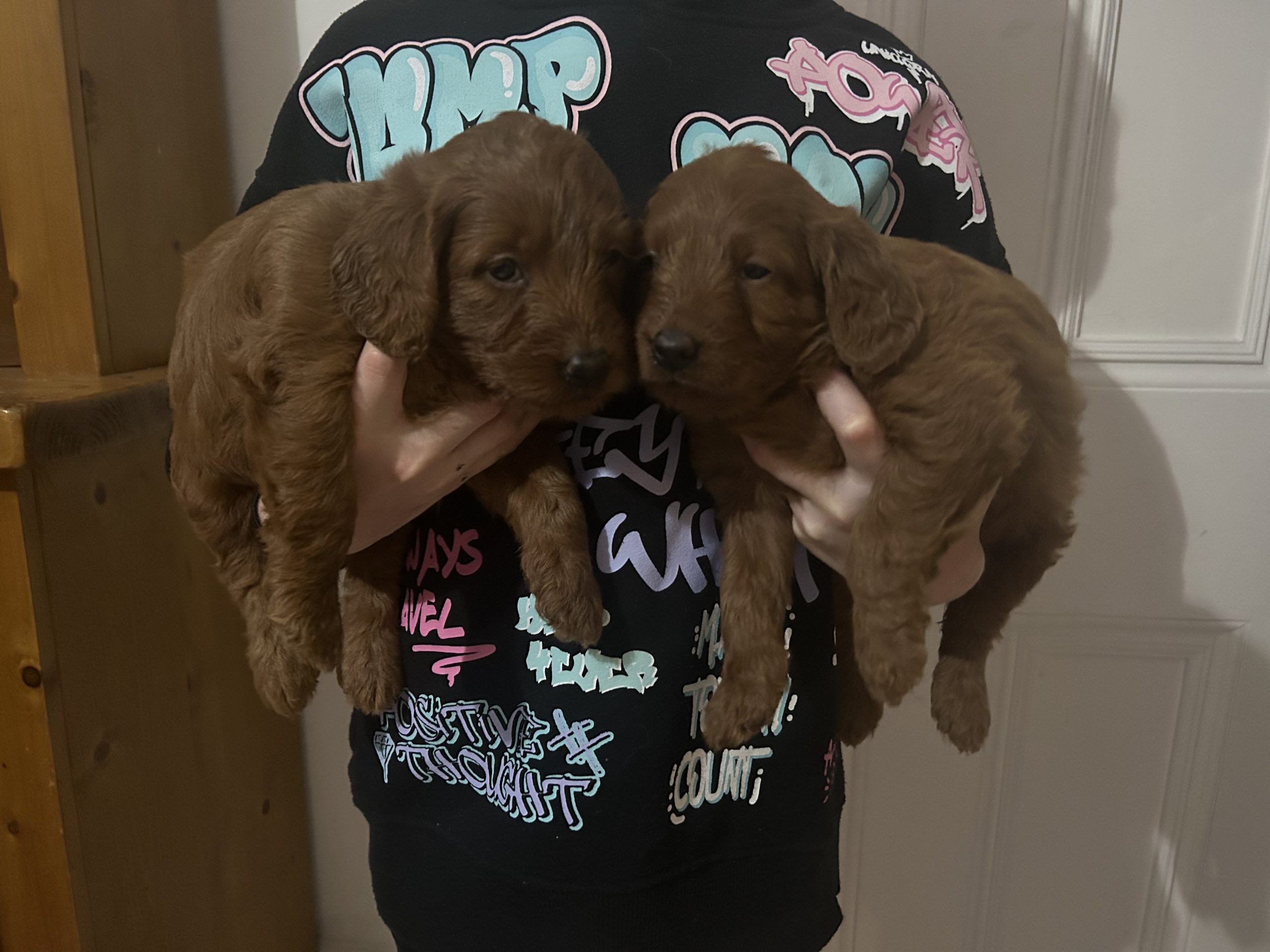 We are pleased to announce we have two quality F1 deep Red Labradoodle pups available from health tested parents.